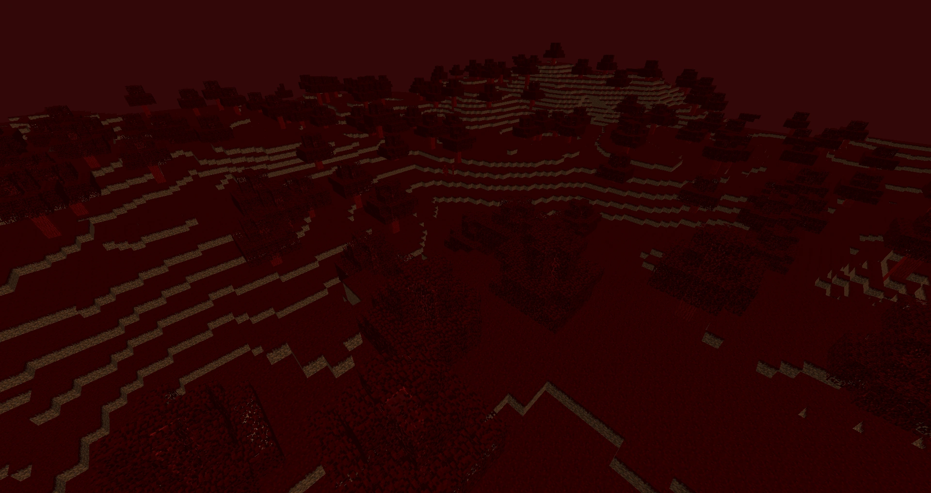 The terrain resembles that of a standard Overworld forest, with hills interrupting the flatter sections. It seems that caves and ravines try to generate, as holes can be found in the grass and dirt of the biome, but the caves and ravines immediately cut off at the Dreadstone layer. This makes exploring natural caves quite a bit harder, seeing as you would have to dig much more to get to a depth with worthwhile rewards.